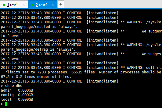此时熟悉的界面就出来了,可以执行数据库操作了,输入show dbs来检测一下吧。